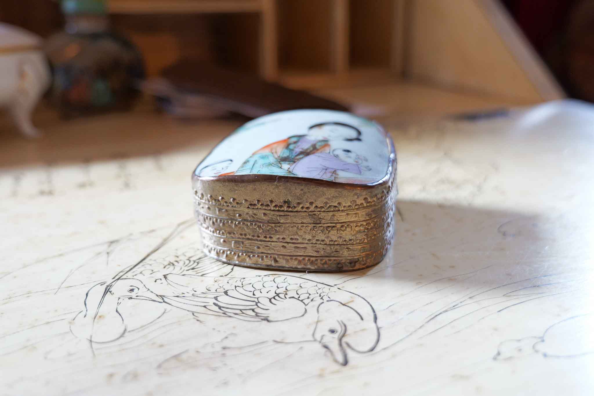 VINTAGE ORIENTAL PORCELAIN & METAL TRINKET BOX (FIGURAL SCENE)