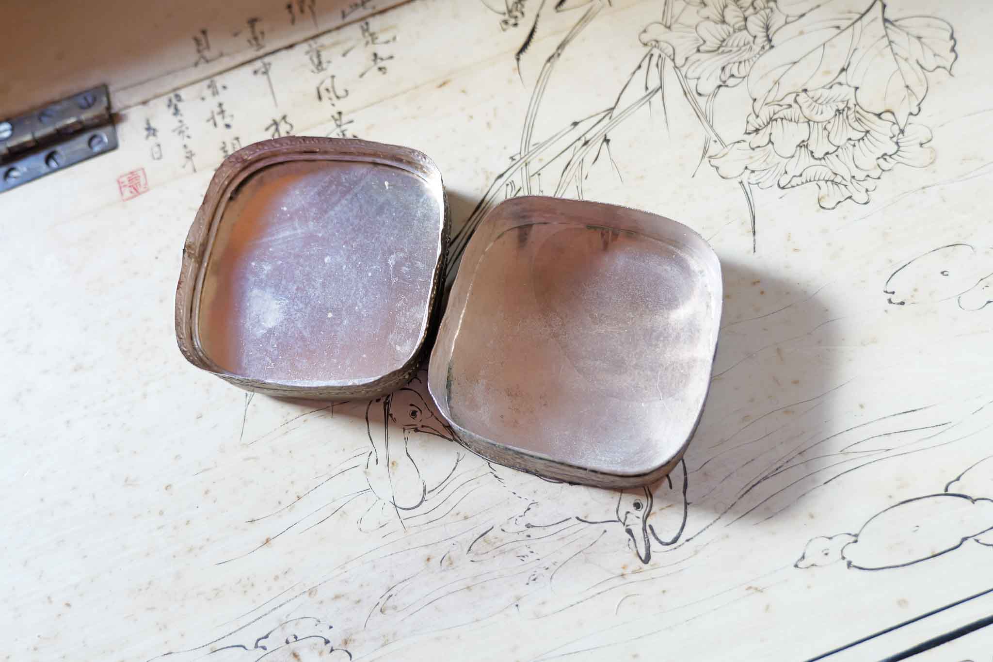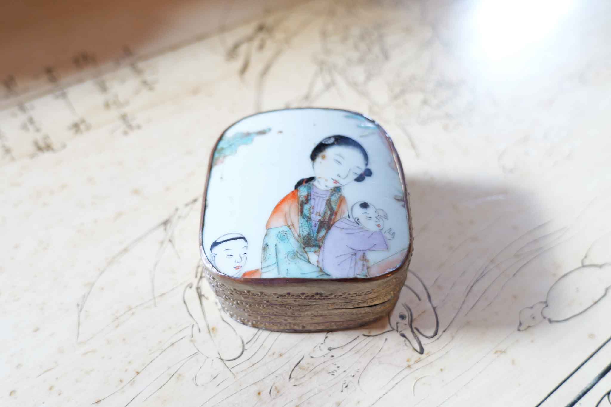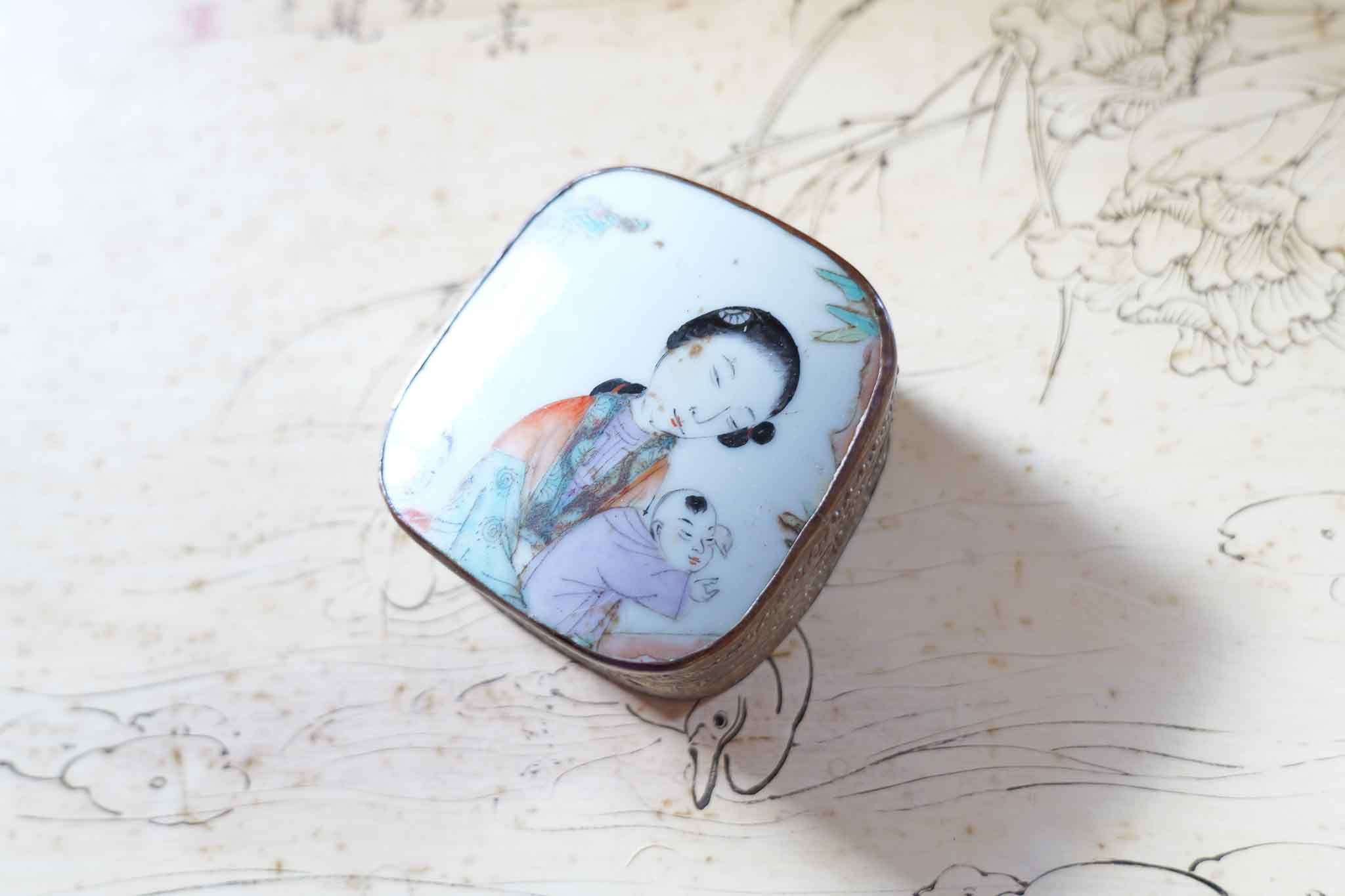 Likely mid-20th century export piece, blending traditional Asian imagery with decorative Western-style trinket box construction. Compact size makes it perfect for jewelry, pills, or small keepsakes.