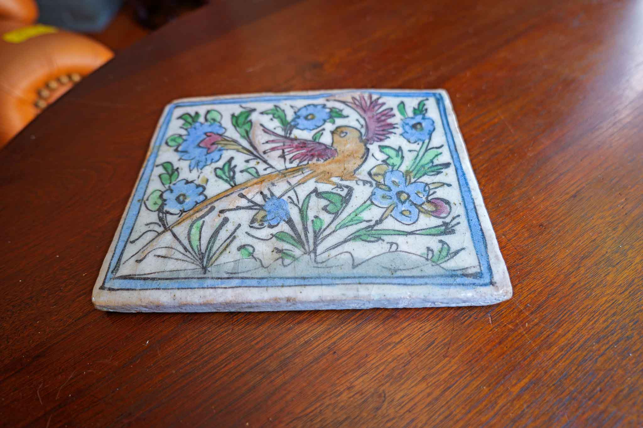 This rectangular tile measures approximately 8.75” x 7” and is ideal for wall display, shelf decor, or grouping with similar tiles. The artwork reflects traditional Middle Eastern floral and bird themes commonly reproduced in decorative ceramics.