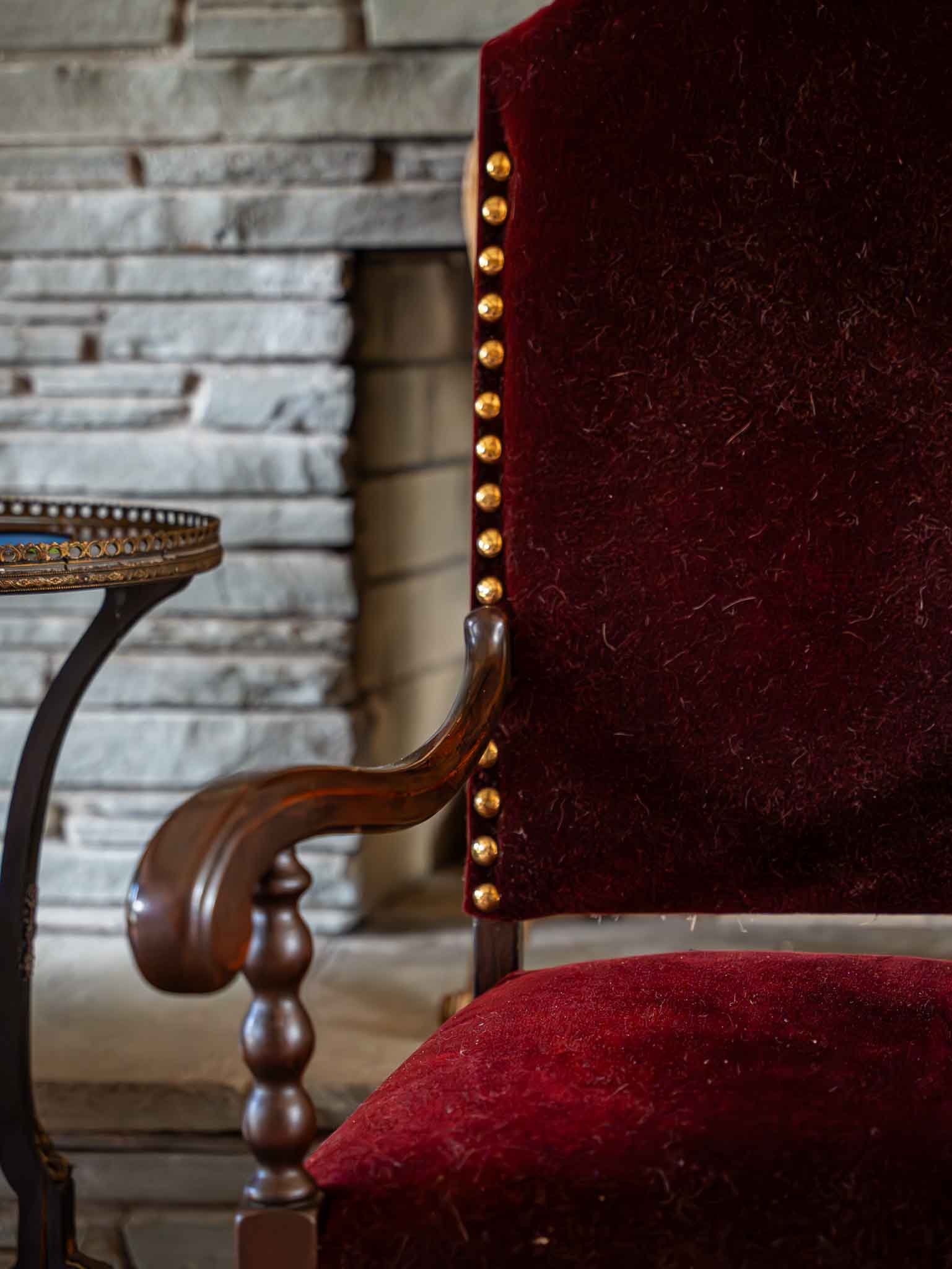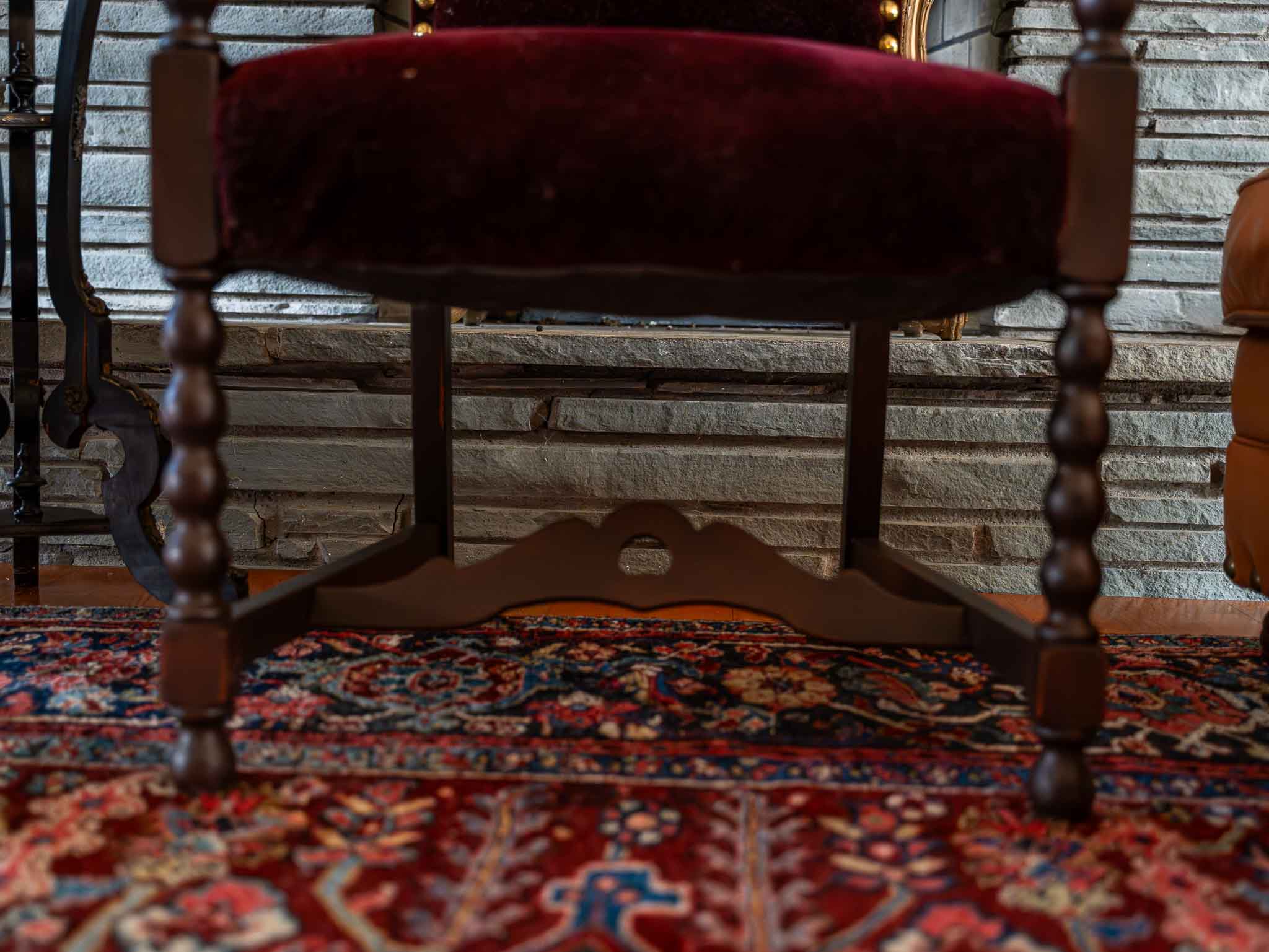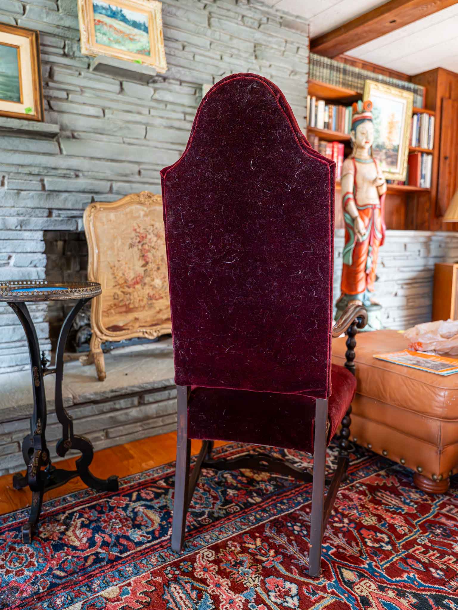 Vintage high-back armchair upholstered in deep red velvet with classic nailhead trim along the backrest. Features carved wood arms and turned legs with a stretcher base, giving it a traditional, stately look.