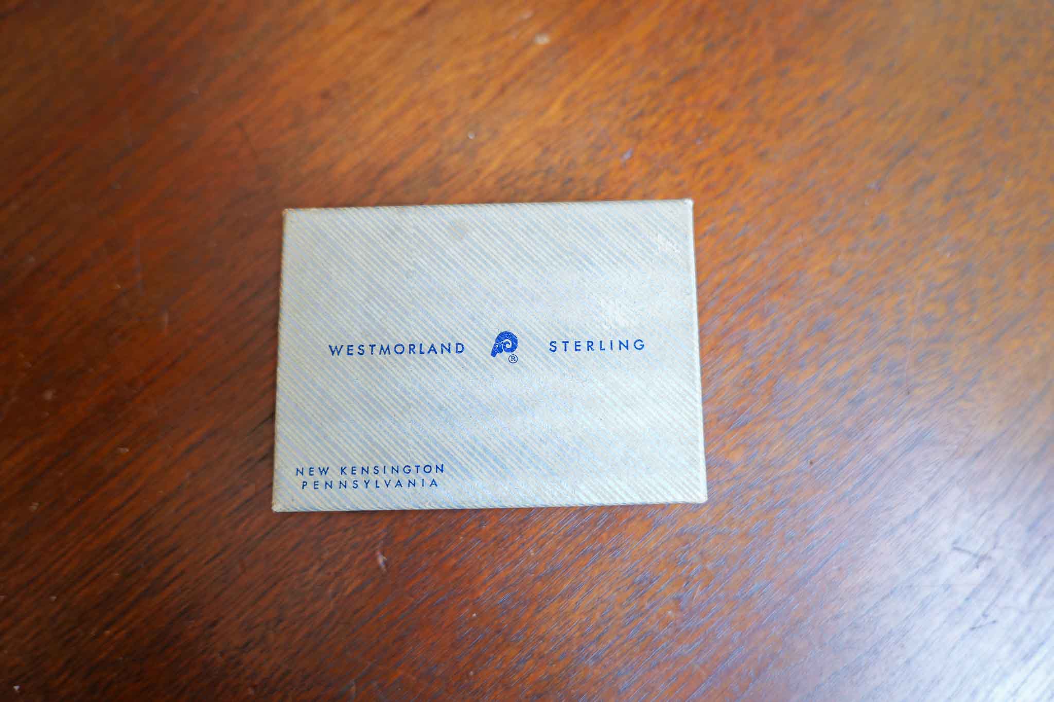 Set of vintage salt service pieces featuring a Westmoreland Sterling silver salt spoon paired with a Cambridge crystal salt cellar, each in its original fitted box.