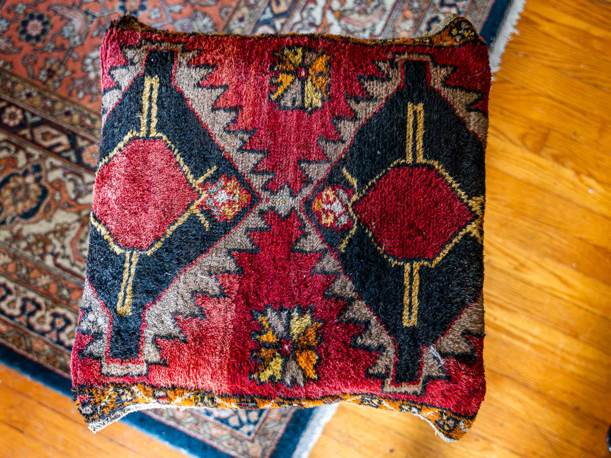 Unique vintage wooden bench featuring a custom upholstered seat made from a richly patterned rug textile. The bold red, black, and gold geometric design adds character and warmth, while the curved wooden legs give it a classic, elegant silhouette.