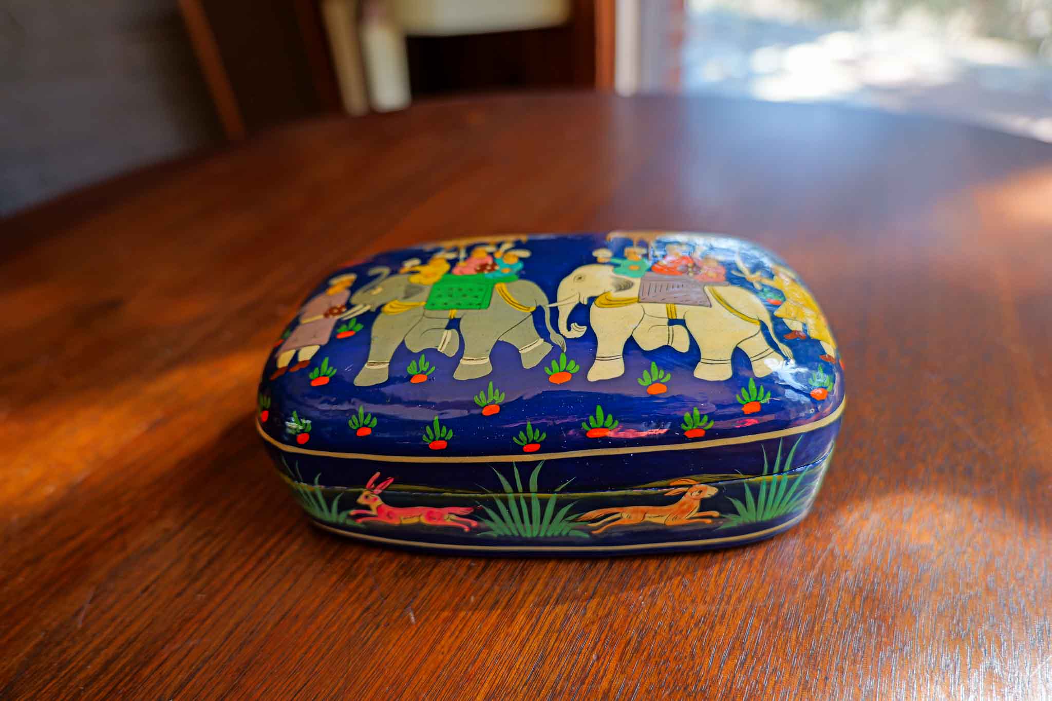Small rectangular wooden trinket box featuring a colorful hand-painted scene of figures riding elephants in a traditional Indian-style procession. Deep navy background with vibrant detailing and lacquered finish.